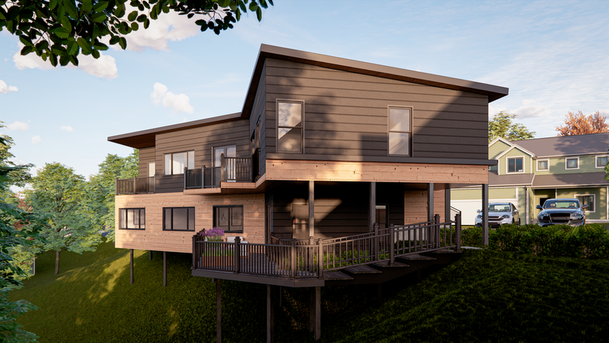 For this project, a modern two-unit home adapts naturally to its hillside lot. The bold facade combines dark siding with warm wood tones, while the angular footprint creates dynamic, functional spaces.